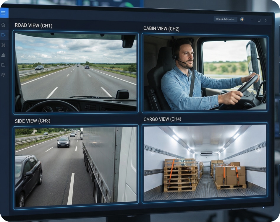 Road-facing, cabin-facing, side-view, and cargo cameras give you full context for every event. No blind spots. No ambiguity about what happened.