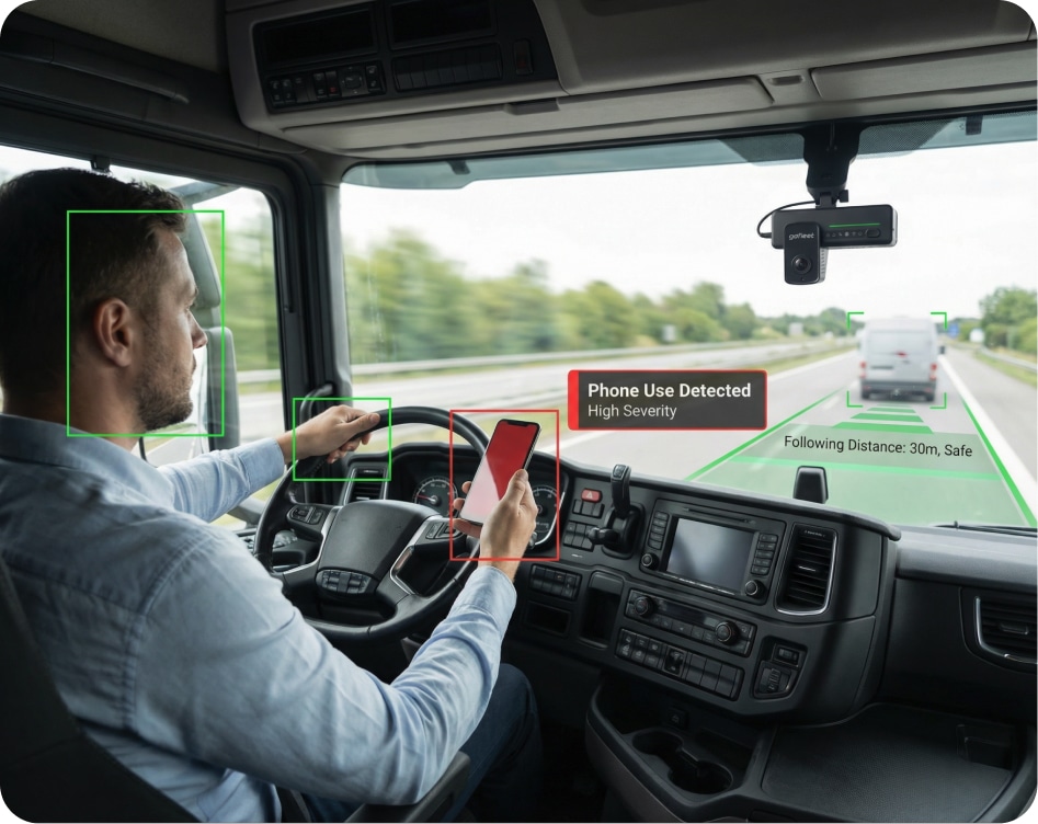 The system uses computer vision to identify distraction, drowsiness, phone use, smoking, seatbelt violations, following distance, lane departure, forward collision risk, and harsh driving — automatically, across every shift.